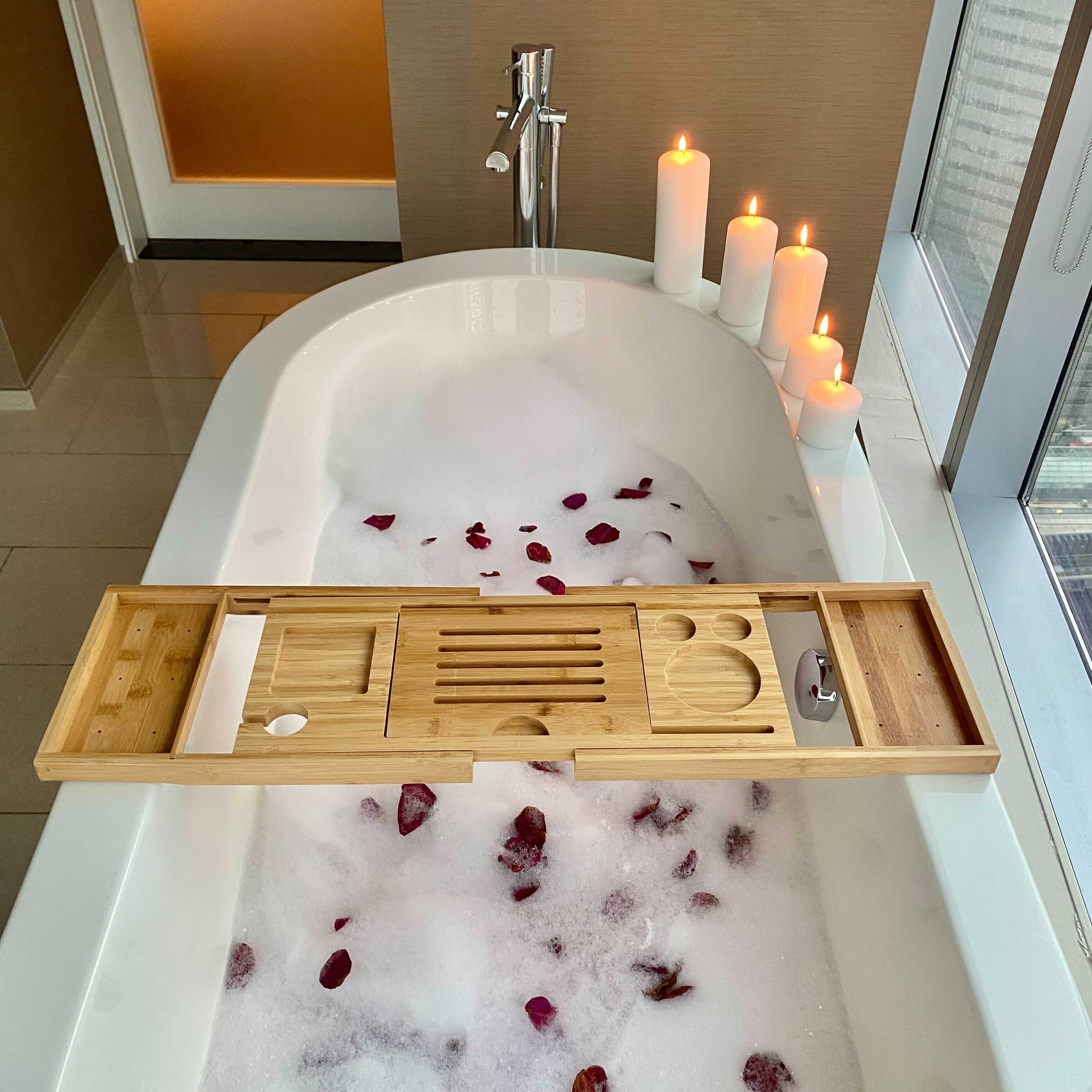 Our tray has slots for anything you need to entertain yourself - light up candles, bring a glass of wine and a nice book or movie on your tablet.
